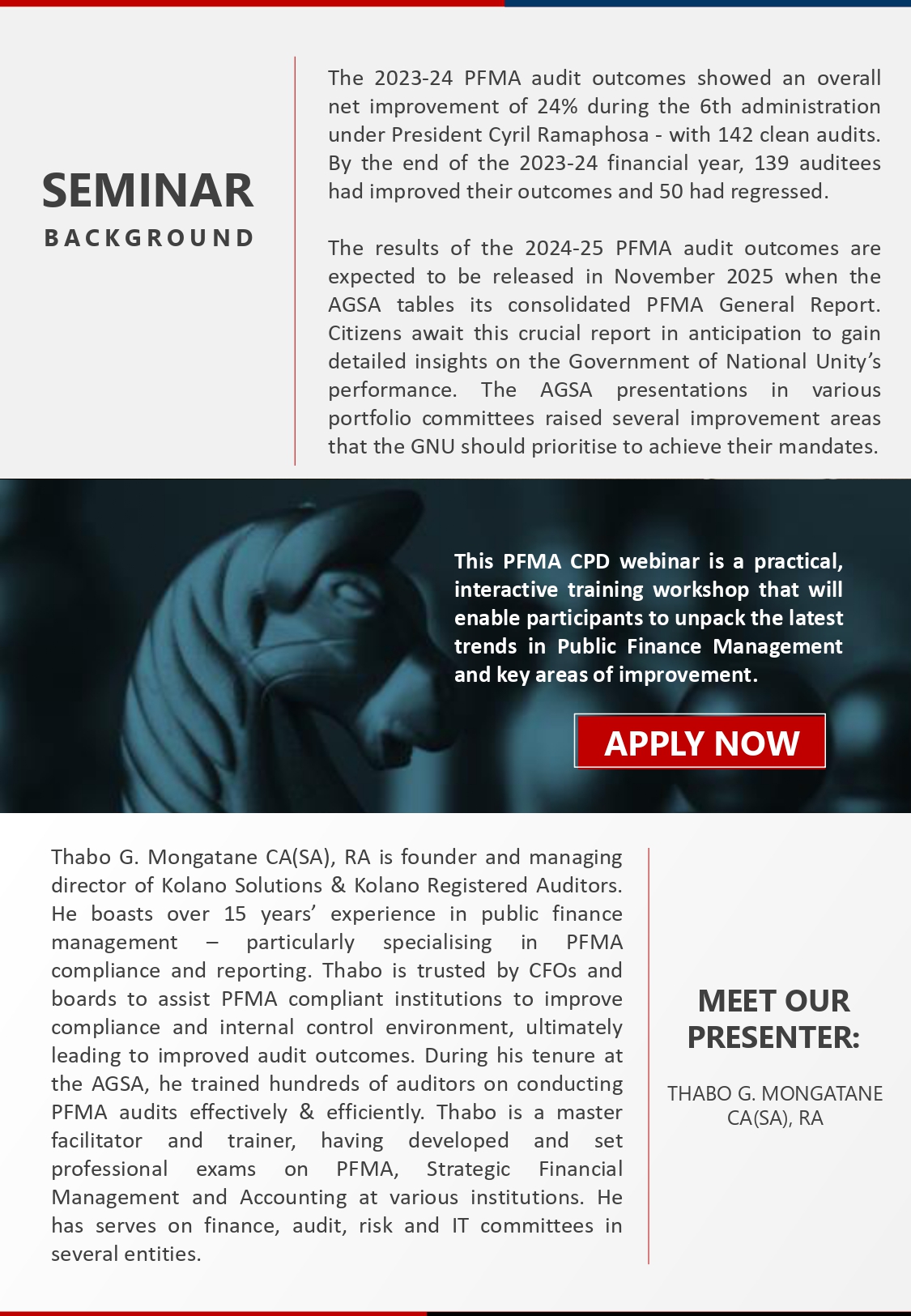 Thabo G. Mongatane CA(SA), RA is founder and managing director of Kolano Solutions & Kolano Registered Auditors. He boasts over 15 years’ experience in public finance management – particularly specialising in PFMA compliance and reporting. Thabo is trusted by CFOs and boards to assist PFMA compliant institutions to improve compliance and internal control environment, ultimately leading to improved audit outcomes. During his tenure at the AGSA, he trained hundreds of auditors on conducting PFMA audits effectively & efficiently. Thabo is a master facilitator and trainer, having developed and set professional exams on PFMA, Strategic Financial Management and Accounting at various institutions. He has serves on finance, audit, risk and IT committees in several entities. Read his full profile here